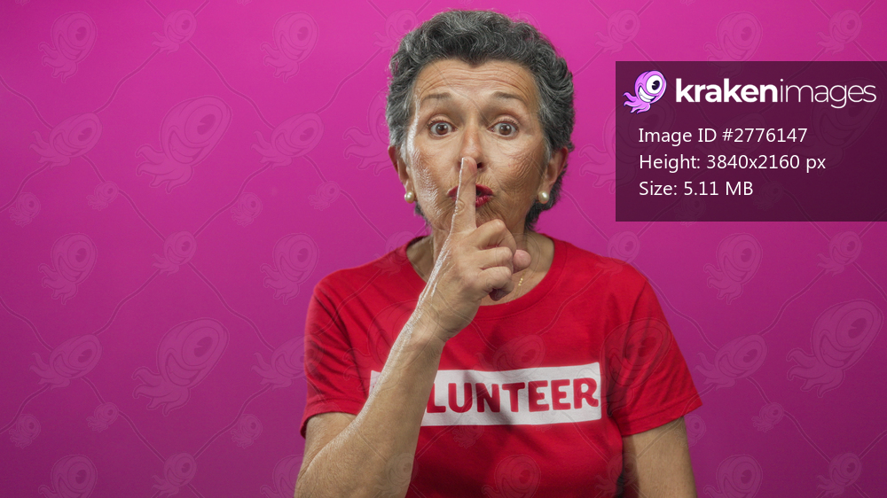 Senior woman with grey hair wearing a volunteer shirt gestures for silence against a vibrant pink background, conveying a message of quiet and introspection. - Kraken Images