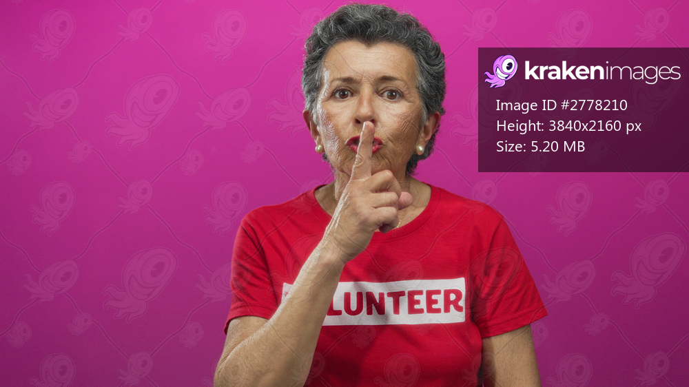 Senior woman with grey hair wearing a volunteer shirt gestures for silence against a vibrant pink background, conveying a message of quiet and introspection. - Kraken Images
