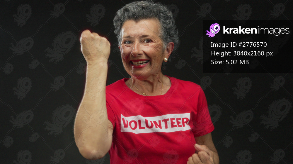 Senior woman with grey hair wearing a volunteer shirt pumps her fist energetically against a black background, embodying enthusiasm and community spirit. - Kraken Images
