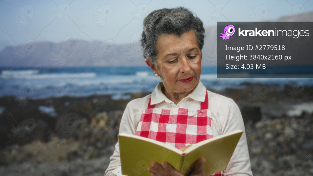 Senior woman with grey hair wearing apron reading a book at seaside beach with mountains in background.