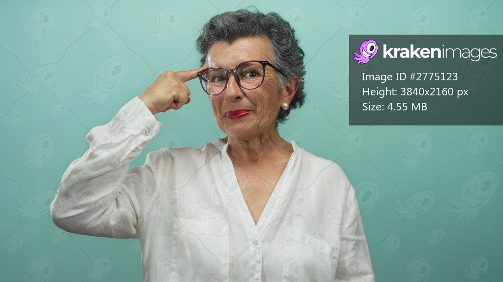 Senior woman with grey hair wearing glasses points to her head in a playful gesture against a blue background.