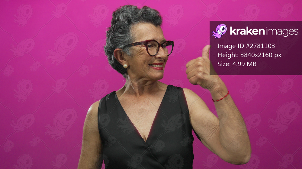 Senior woman with grey hair wearing glasses shows thumbs up and thumbs down against a vibrant pink background, reflecting mixed emotions and vibrant expression. - Kraken Images