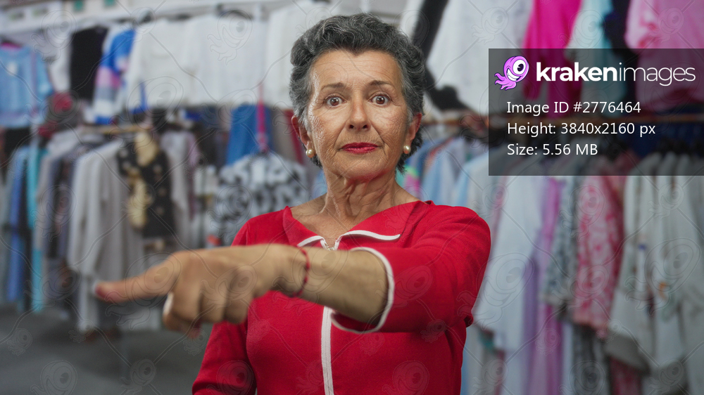 Senior woman with grey hair wearing red sweater points inside a retail clothing store, surrounded by colorful garments, highlighting shopping experience.