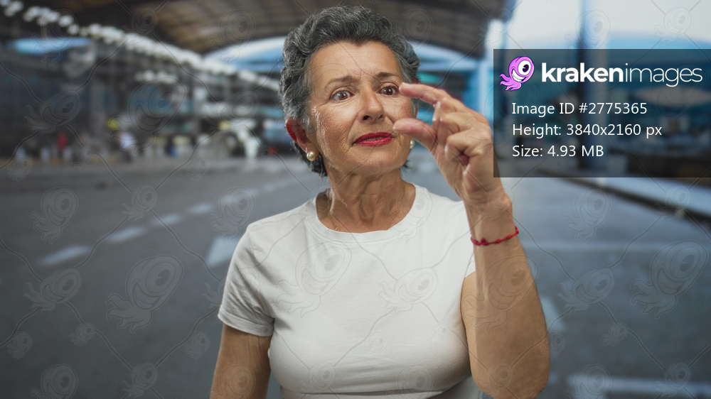 Senior woman with grey hair and white shirt making small size gesture with fingers at outdoor airport setting.