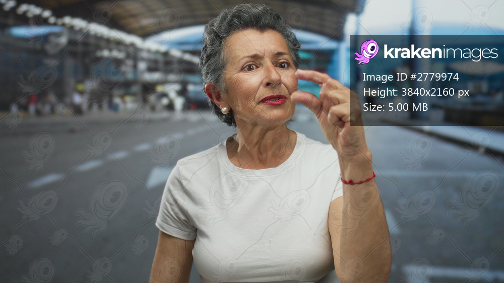 Senior woman with grey hair and white shirt making small size gesture with fingers at outdoor airport setting.