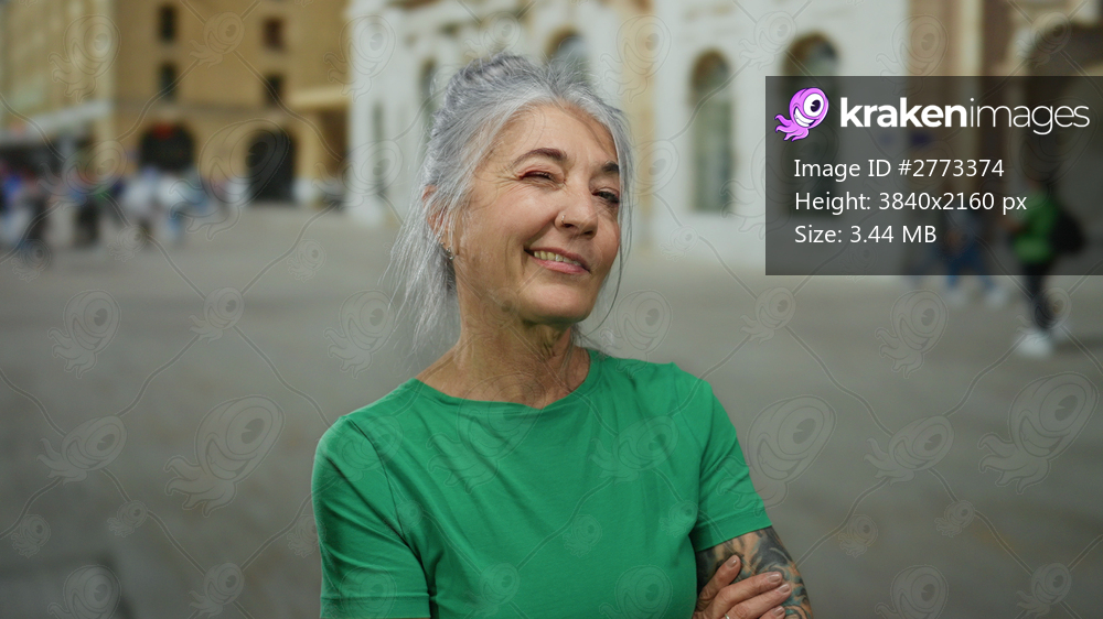Senior woman with grey hair winks in a green shirt with tattoos, arms crossed, standing on a lively street outdoors, capturing a moment of confident charm surrounded by urban energy. - Kraken Images