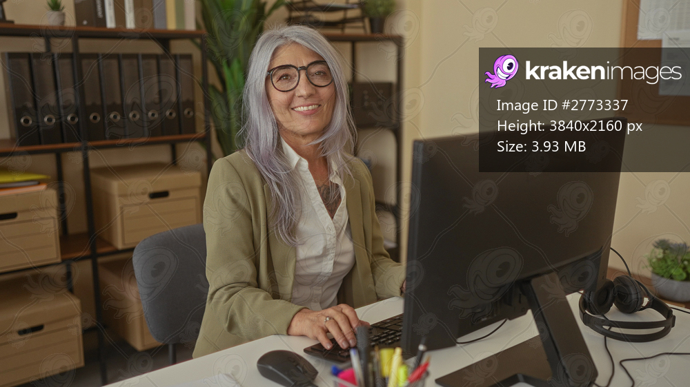 Senior woman with grey hair working in a modern office setting, typing on a computer and wearing glasses, surrounded by office supplies and shelves in an indoor workspace. - Kraken Images