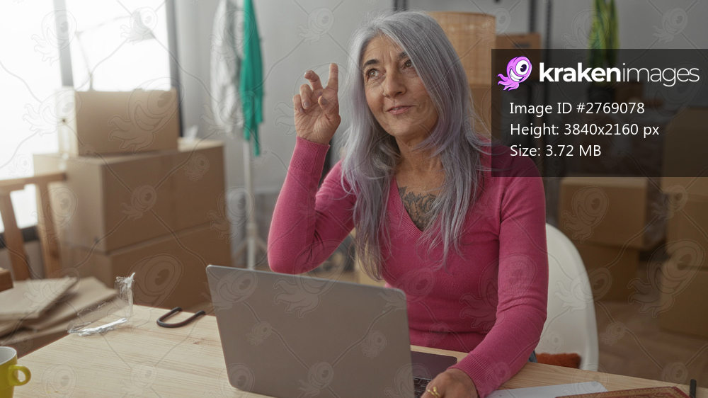 Senior woman with grey hair working on a laptop in a new home living room surrounded by moving boxes, creating an atmosphere of transition and new beginnings. - Kraken Images
