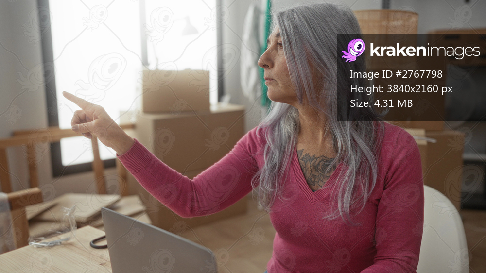 Senior woman with grey hair works on a laptop in a new apartment, surrounded by moving boxes, indicating a recent move and engagement with technology in a home setting. - Kraken Images