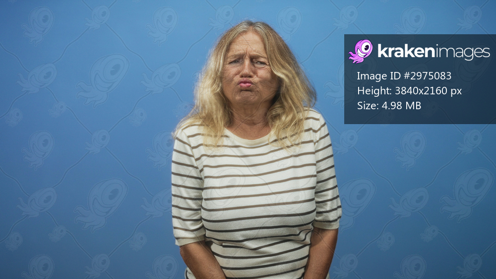 Senior woman grimacing with raised hands and puckered lips, eyes tightly closed and hair tousled while standing against a plain blue studio wall; disgust. - Kraken Images