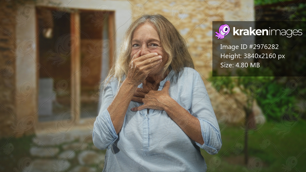 Senior woman with hand covering mouth and other hand pressed to chest in front of stone building, wearing blue blouse with garden path visible; surprise. - Kraken Images