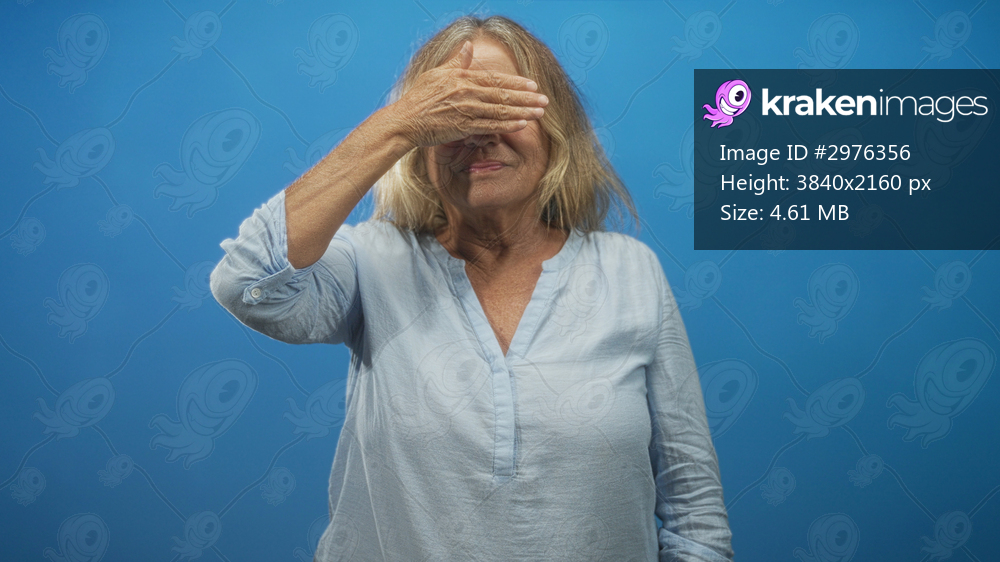 Senior woman with hand covering mouth and palm raised in stop gesture against blue studio wall; privacy.