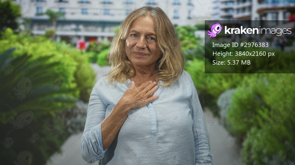 Senior woman with hand on chest and closed eyes wearing light blue blouse on street plaza in front of building, gentle smile; serenity gratitude mindfulness. - Kraken Images