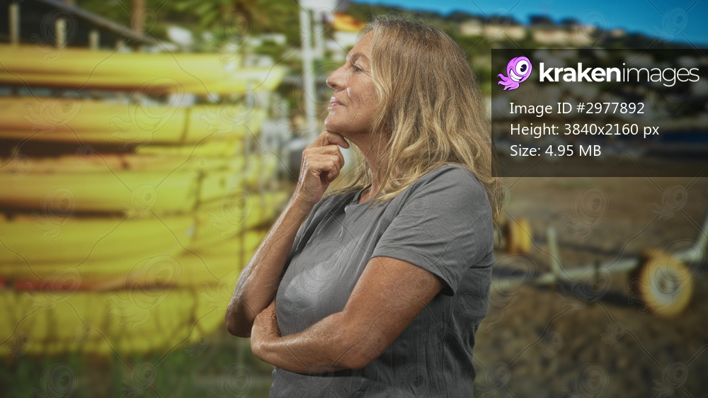 Senior woman with hand on chin beside stacked yellow kayaks and a beach trolley at a sunny mediterranean beach, gazing sideways; serenity reflection.
