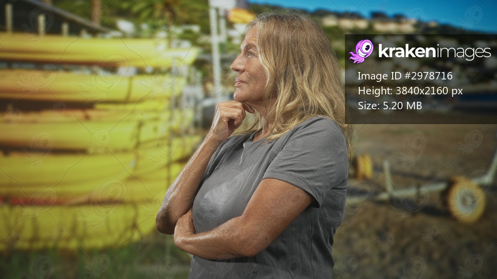 Senior woman with hand on chin beside stacked yellow kayaks and a beach trolley at a sunny mediterranean beach, gazing sideways; serenity reflection.