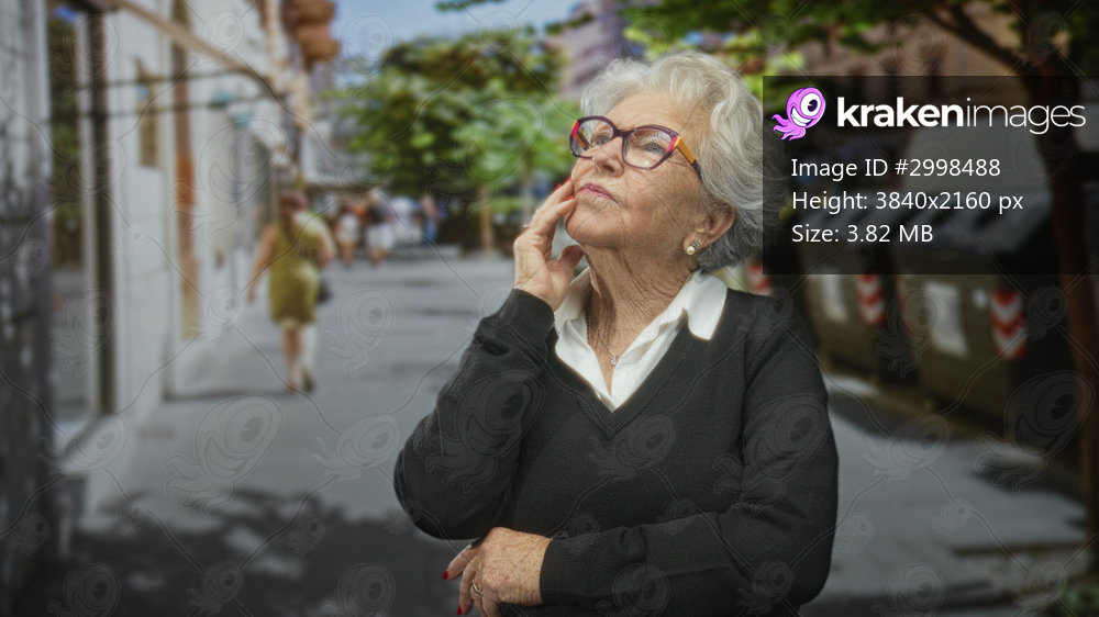 Senior woman hand on chin pensive pose on a street wearing glasses and sweater; quiet contemplation solitude.
