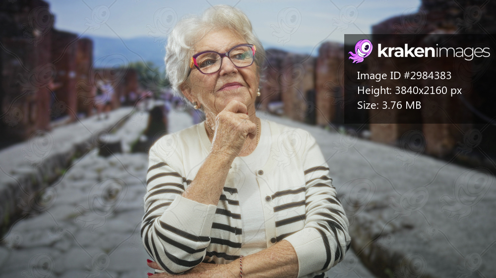 Senior woman with hand on chin wearing colorful glasses and striped cardigan, posed on a cobbled ancient street; contemplation memory travel.