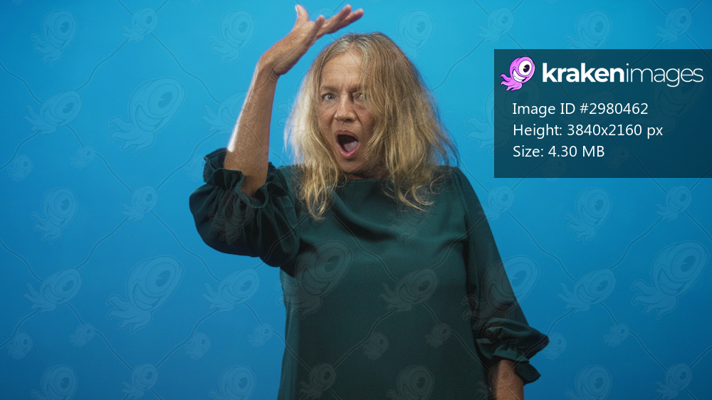 Senior woman with hand on head and open mouth in blue studio, looking startled and gesturing upward; surprise.