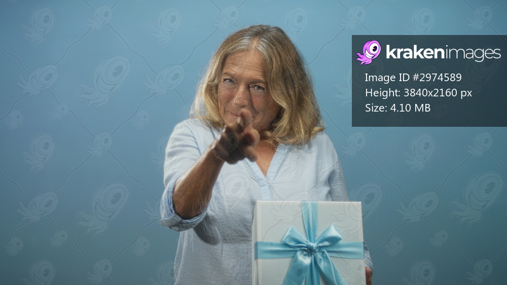 Senior woman with hand on hip points finger while holding wrapped gift box with blue ribbon at waist in studio; confidence celebration.