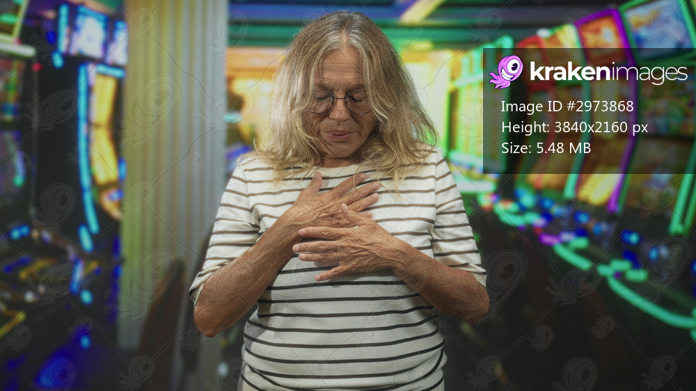 Senior woman with hands on chest in front of slot machines in a casino, wearing striped shirt and glasses, looking upward; quiet gratitude.