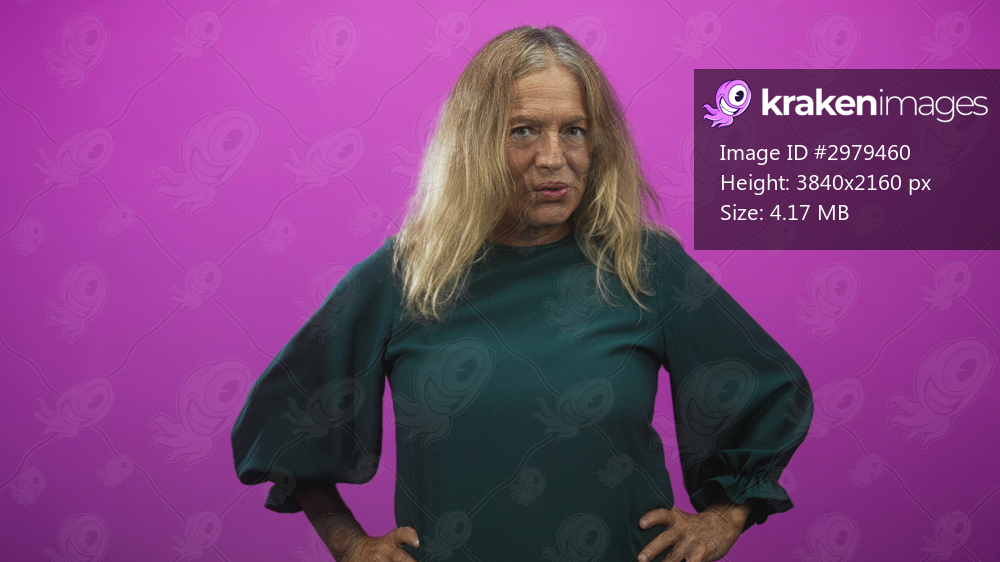 Senior woman hands on hips facing camera in studio with magenta backdrop wearing green dress and tousled blonde hair; confidence introspection.