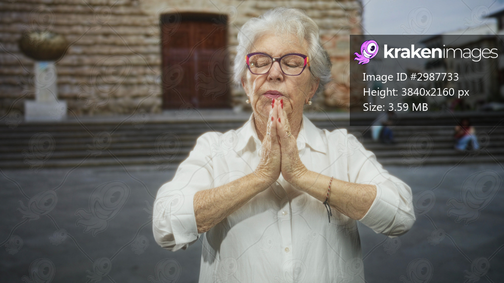 Senior woman with hands pressed in prayer on church building steps, wearing glasses and white shirt, rosary bracelet visible; devotion serenity.