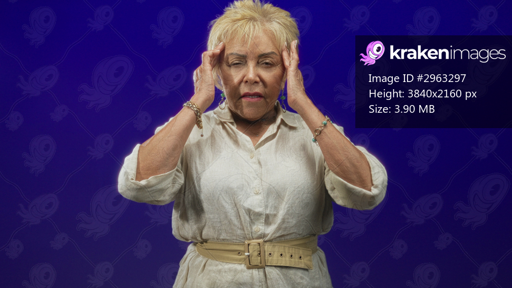 Senior woman with hands pressed to temples, eyes shut, wearing a light linen shirt and wide belt in a deep blue studio; headache pain.