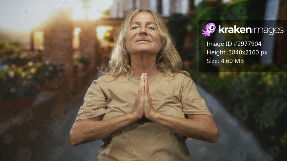 Senior woman with hands pressed together in prayer gesture on a sunlit street lined with flower planters and brick facades; serenity.