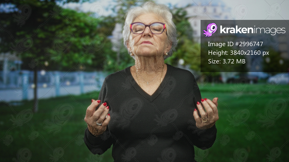 Senior woman with hands raised, gesturing and slightly speaking in front of building, wearing glasses and rings and red nails; reflection serenity.