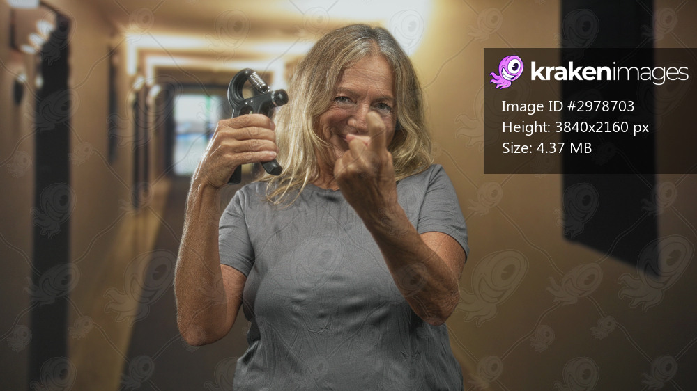 Senior woman holding a handgrip and raising her middle finger in a building hallway; defiance strength.