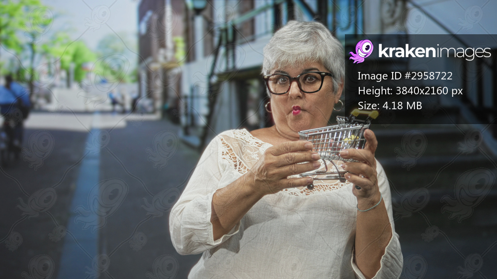 Senior woman holding a mini shoppingcart, hand to chest and puckered lips while inspecting the tiny trolley on a city street stairway; playful curiosity. - Kraken Images