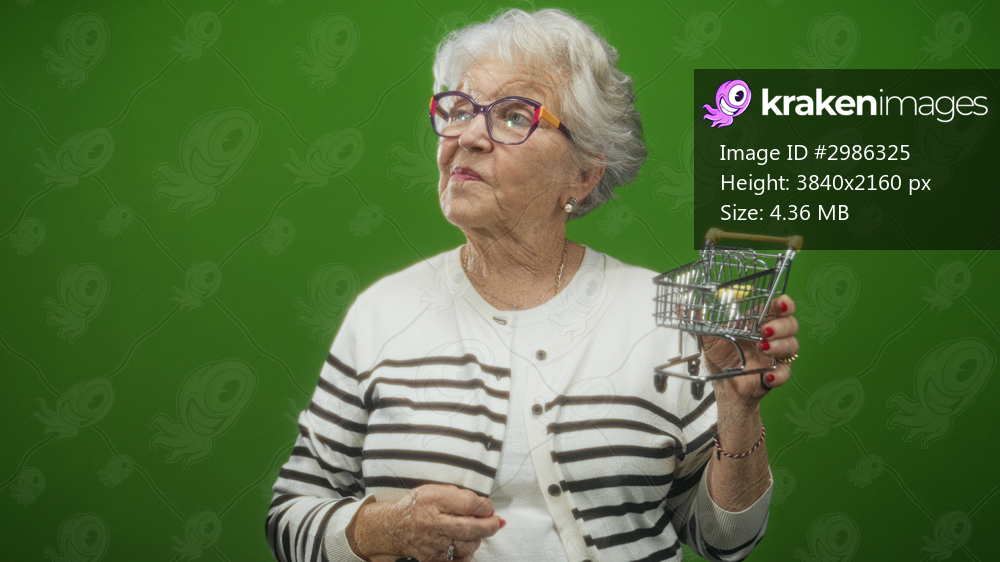 Senior woman holding a miniature shopping cart in her right hand, wearing striped cardigan and colorful glasses, looking upward toward camera in studio; nostalgia. - Kraken Images