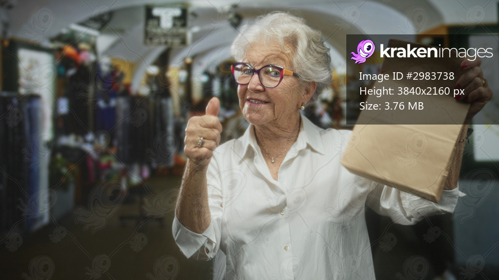 Senior woman holding a paper bag and showing thumbs up with visible hand in a building shopping aisle, wearing colorful glasses and white blouse; confidence independence. - Kraken Images