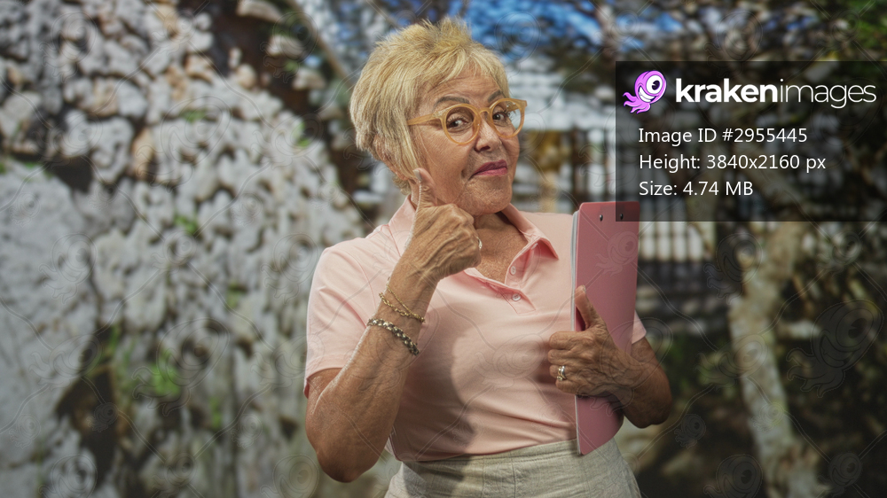 Senior woman holding a pink clipboard gives thumbs up and points to chest in studio; confidence experience.