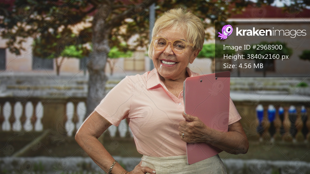Senior woman holding a pink clipboard and smiling in a building courtyard, hand on hip; cheerful confidence.