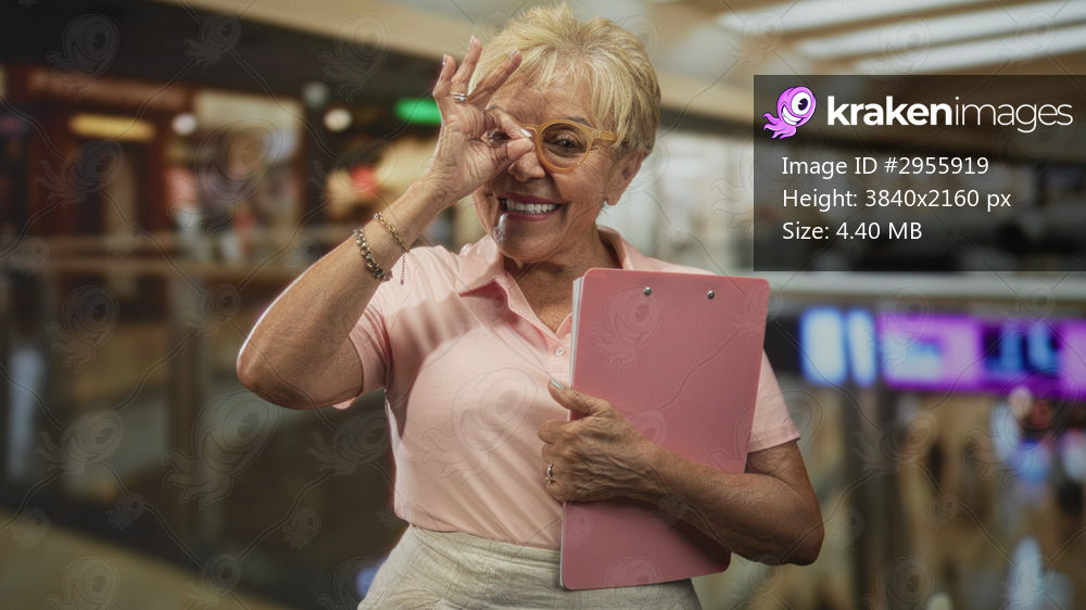 Senior woman holding a pink clipboard, smiling and making an ok gesture with her hand to her eye, wearing glasses and a polo shirt in a building; playful joy. - Kraken Images