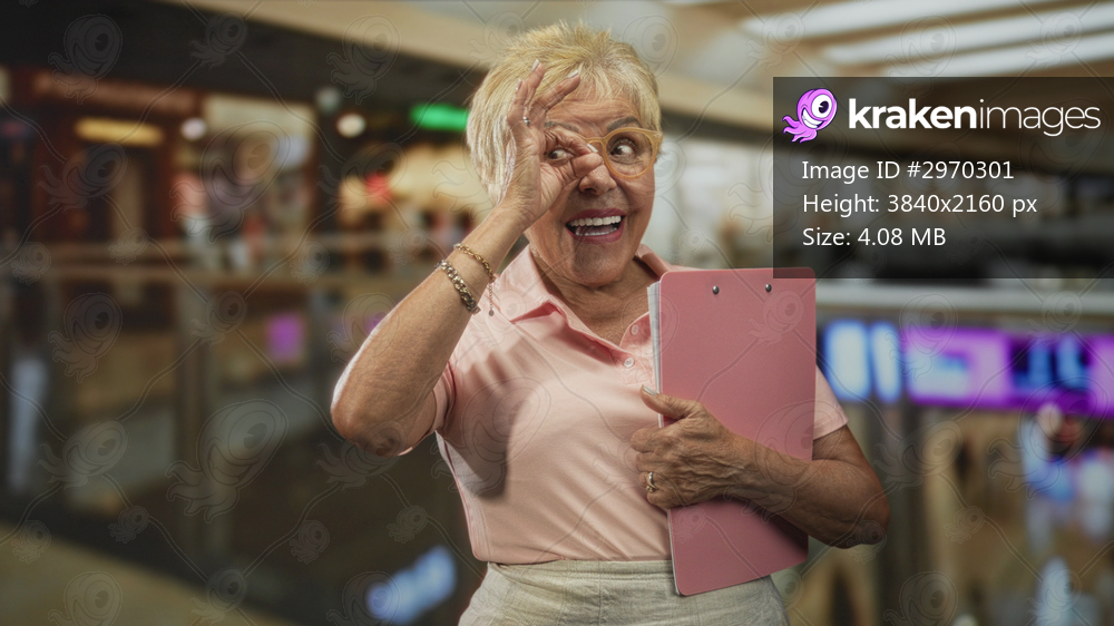 Senior woman holding a pink clipboard, smiling and making an ok gesture with her hand to her eye, wearing glasses and a polo shirt in a building; playful joy. - Kraken Images