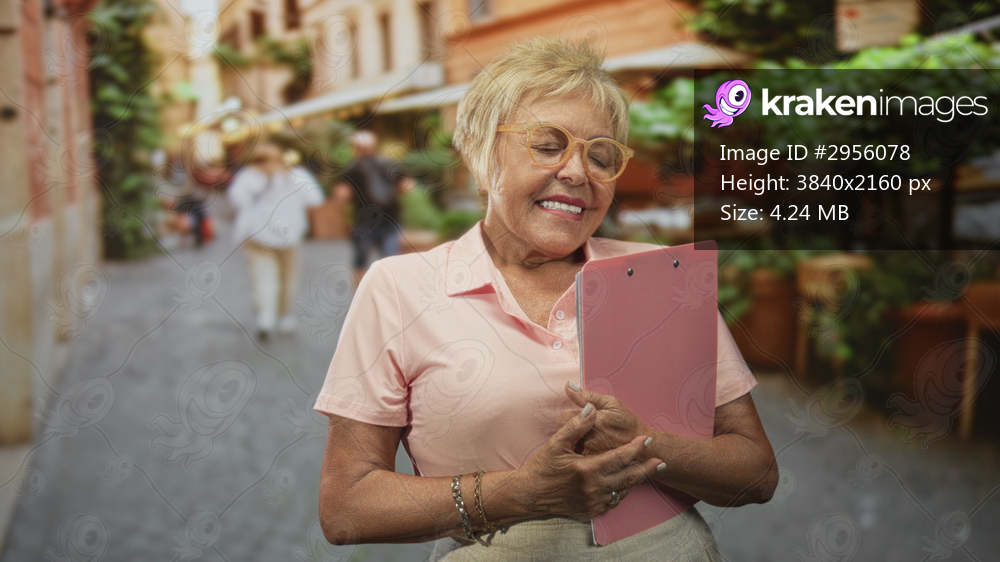 Senior woman holding a pink clipboard to her chest, hands clasped, eyes closed and smiling on a cobblestone street cafe with outdoor tables; serenity.