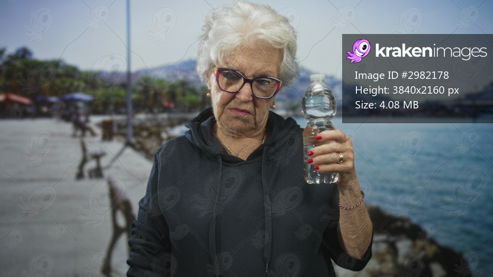Senior woman holding a water bottle in raised hand and grimacing on a street waterfront promenade by the sea; discomfort reflection.