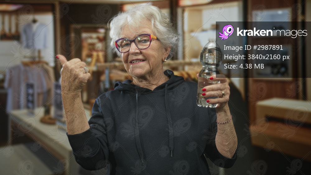 Senior woman holding a water bottle and showing thumbs up inside a retail store; confidence hydration independence.