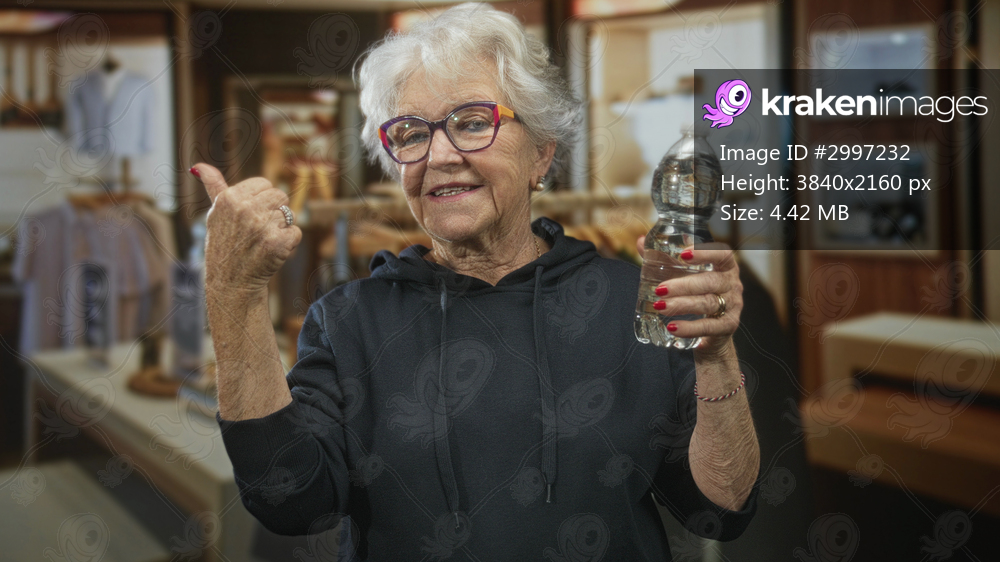 Senior woman holding a water bottle and showing thumbs up inside a retail store; confidence hydration independence.