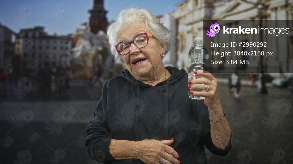 Senior woman holding a water bottle and smiling, showing red painted fingernails and eyeglasses while standing in a street plaza; gentle joy.