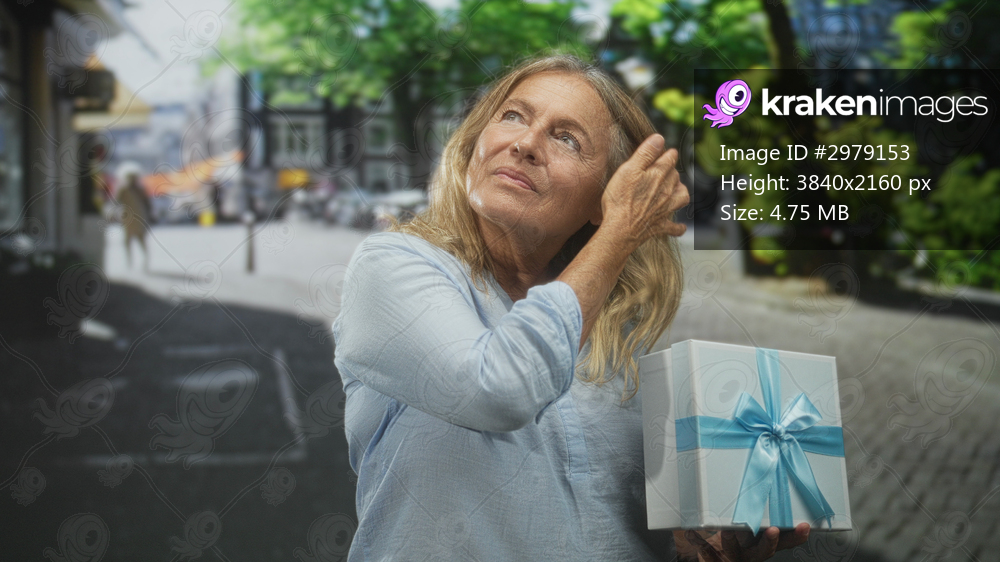 Senior woman holding a white gift box with blue ribbon while touching her hair on a city street; serenity gratitude.