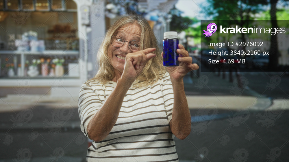 Senior woman holding blue pill bottle and pinching fingers to show a small dose on a city street; health reassurance.