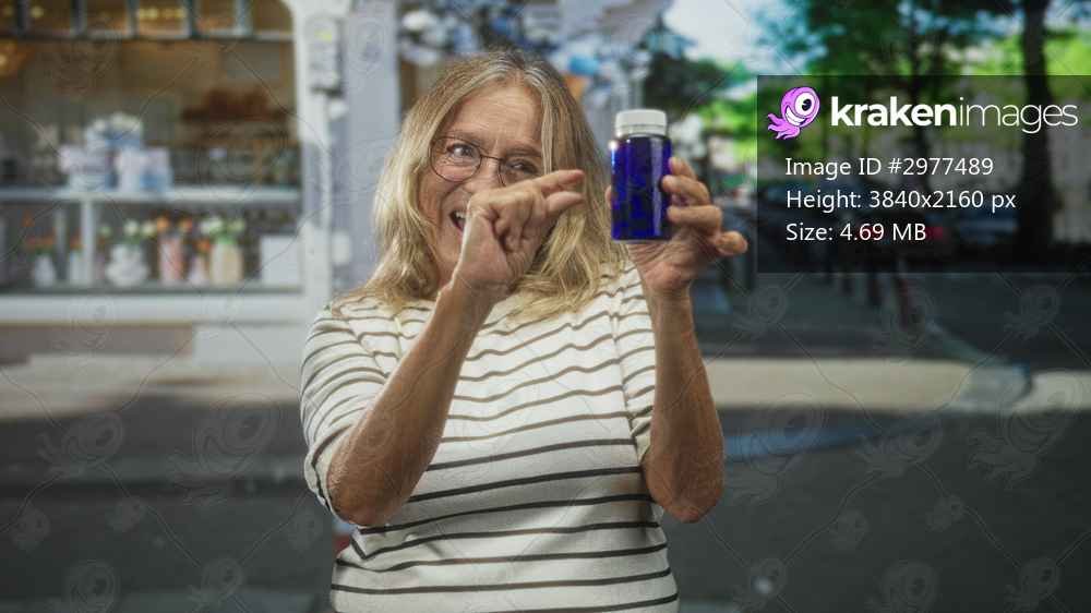 Senior woman holding blue pill bottle and pinching fingers to show a small dose on a city street; health reassurance.