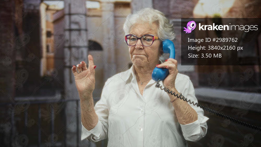 Senior woman holding blue telephone handset and giving thumbs up on a cobblestone street while speaking into a corded phone; reassurance.
