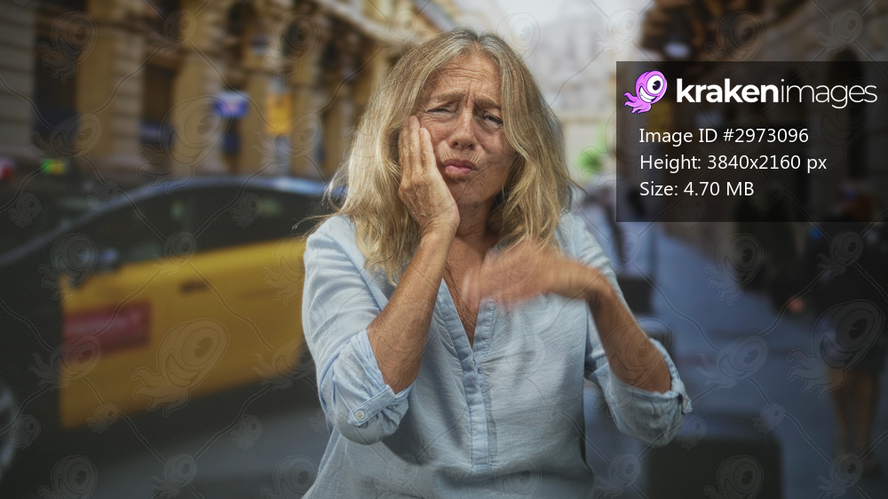 Senior woman holding cheek with hand on street showing toothache and pained facial expression; exhaustion vulnerability.