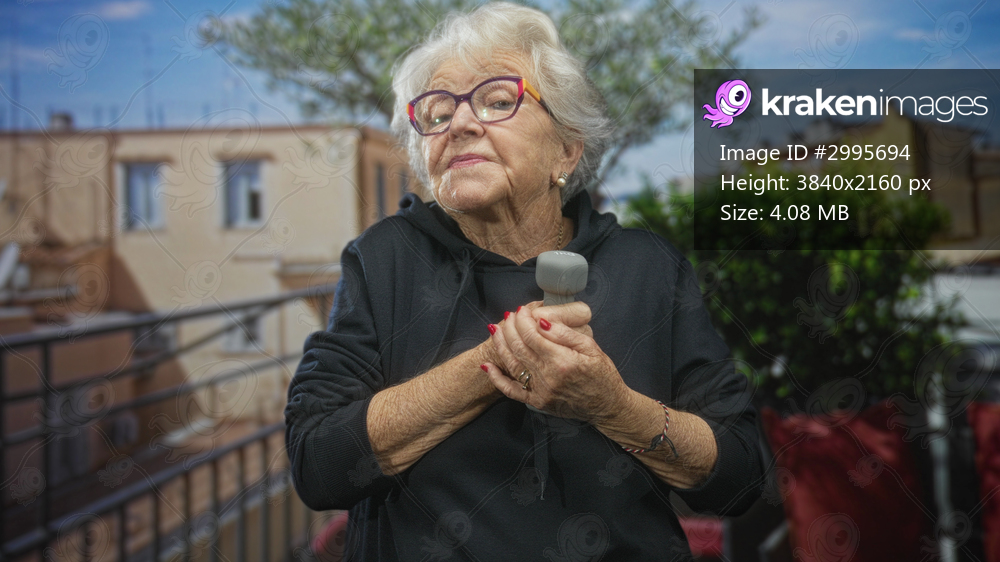 Senior woman holding dumbbell with hands clasped on a building balcony, smiling and exercising for strength and balance; resilience vitality.