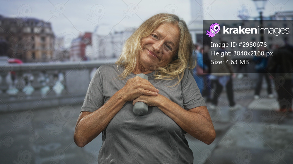 Senior woman holding dumbbell to chest, hands clasped over weight on street; contentment wellness aging.