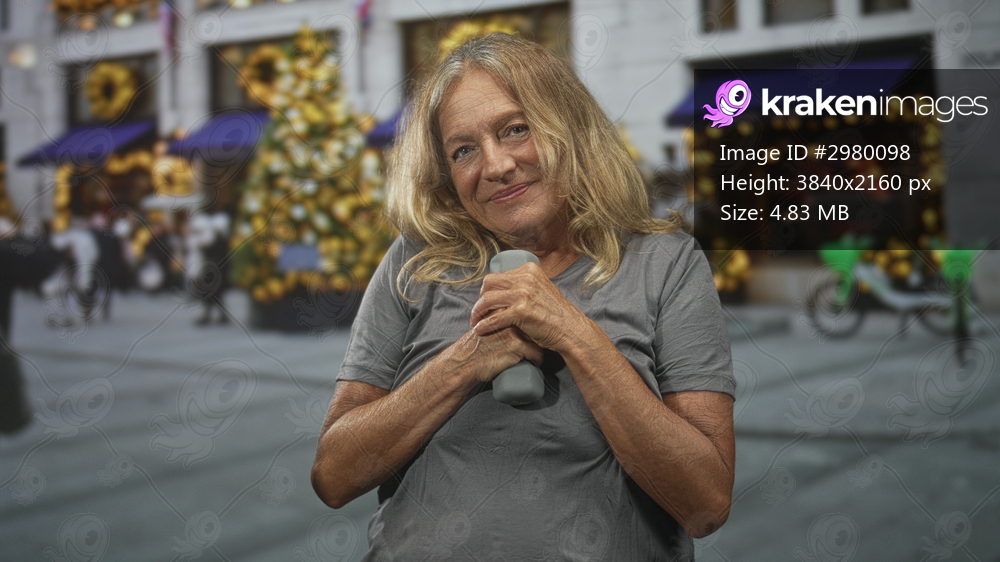 Senior woman holding dumbbell to chest on decorated shopping street with christmas tree and purple awnings; maturity wellness resilience contentment.